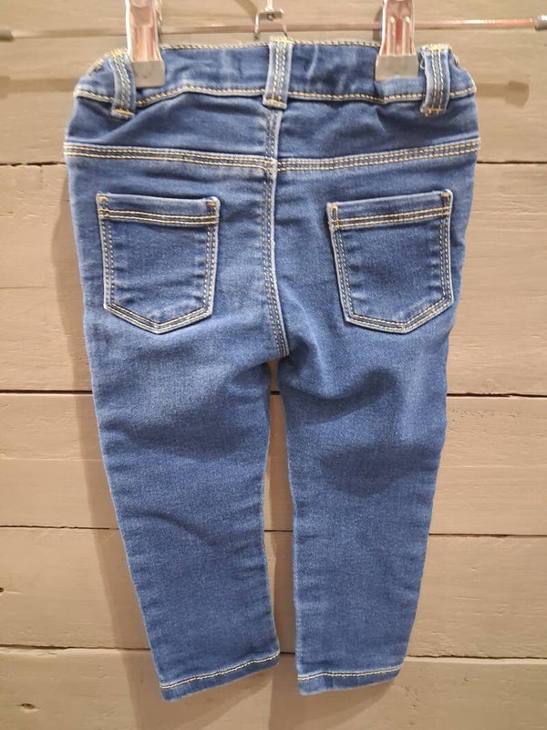 Jean taille élastique réglable 2 boutons pressions. Dessins dur le devant.