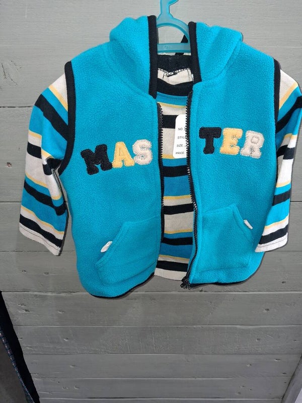 Ensemble 3 pièces multicolore composé d’une veste sans manches à capuche 100%Polyester un t-shirt manches longues 60%coton et 40%polyester et un pantalon à taille élastique 100% polyester doublure 100% coton.