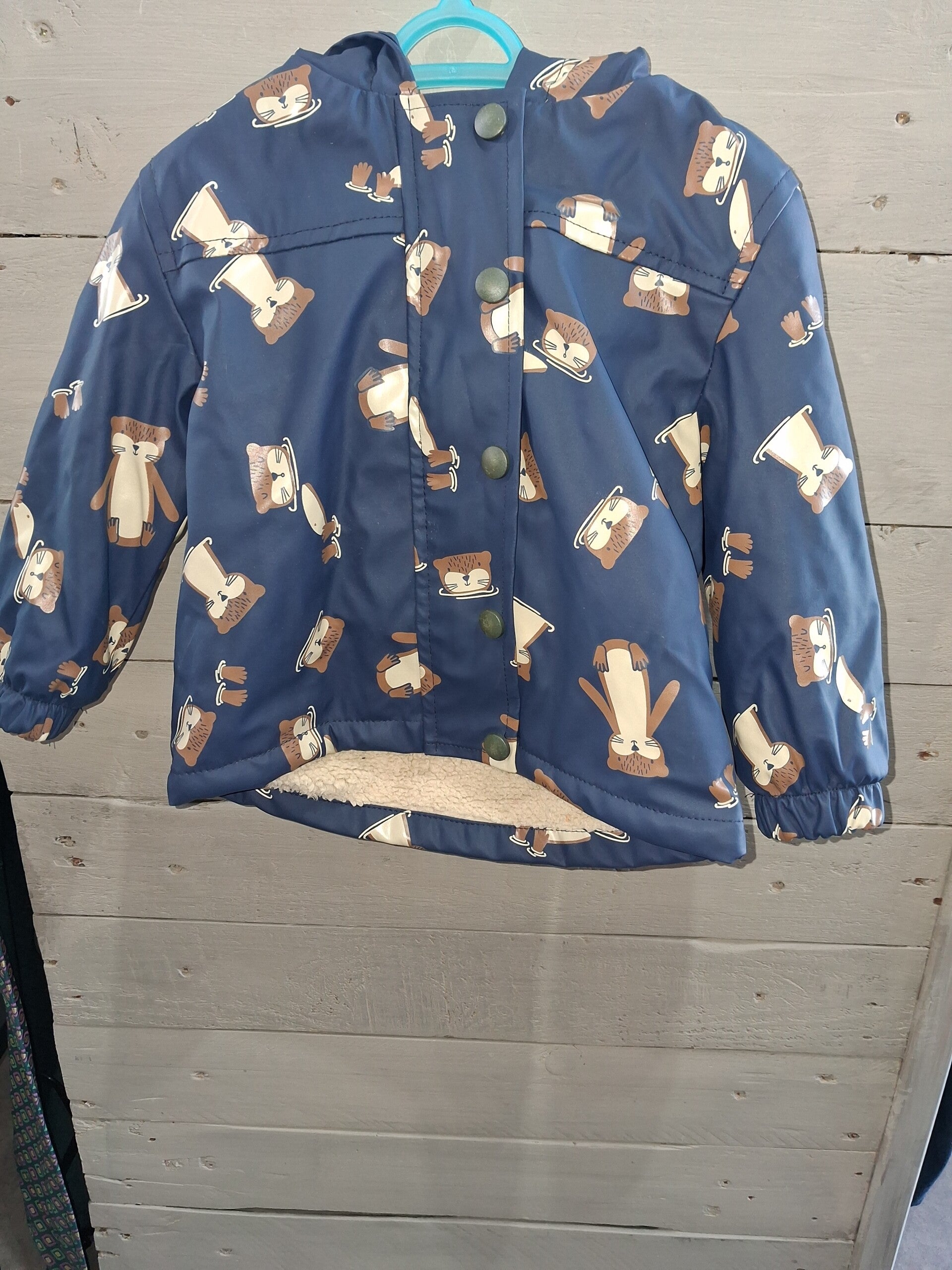 Ciré bleu imprimé doublé à capuche fermeture eclair et boutons pressions.