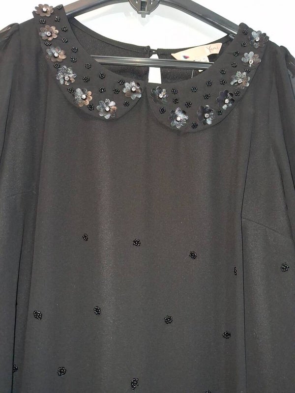 Robe midi mousseline noire doublée avec motifs perles vol Claudine avec perles et fleurs manches longues fermeture eclair sur le côté