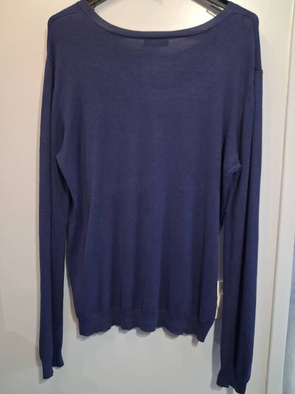 Pull bleu marine imprimé noir devant strass autour du col manches longues