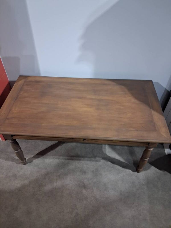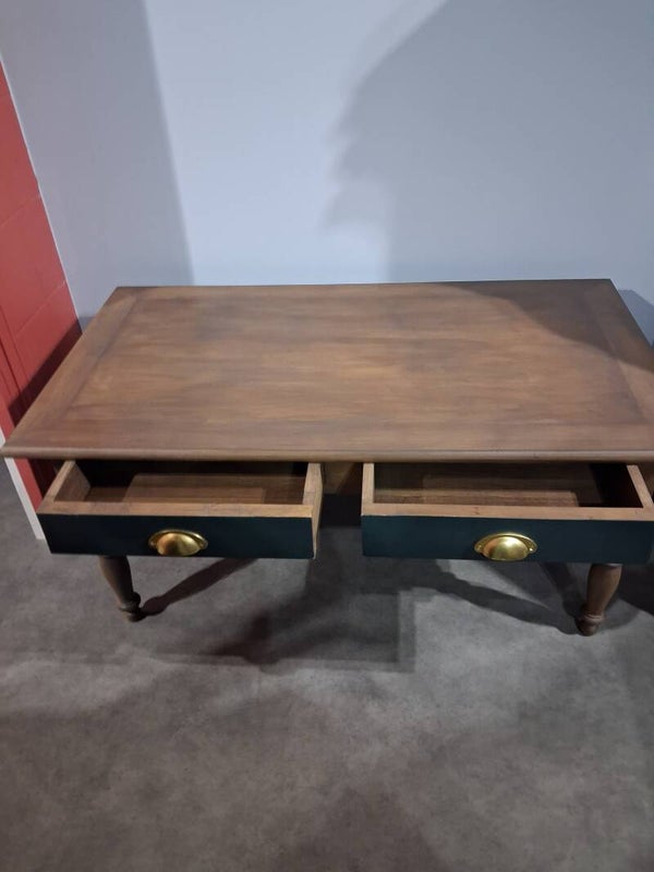 Table basse plateau et pied cirés façades tiroirs vert sapin