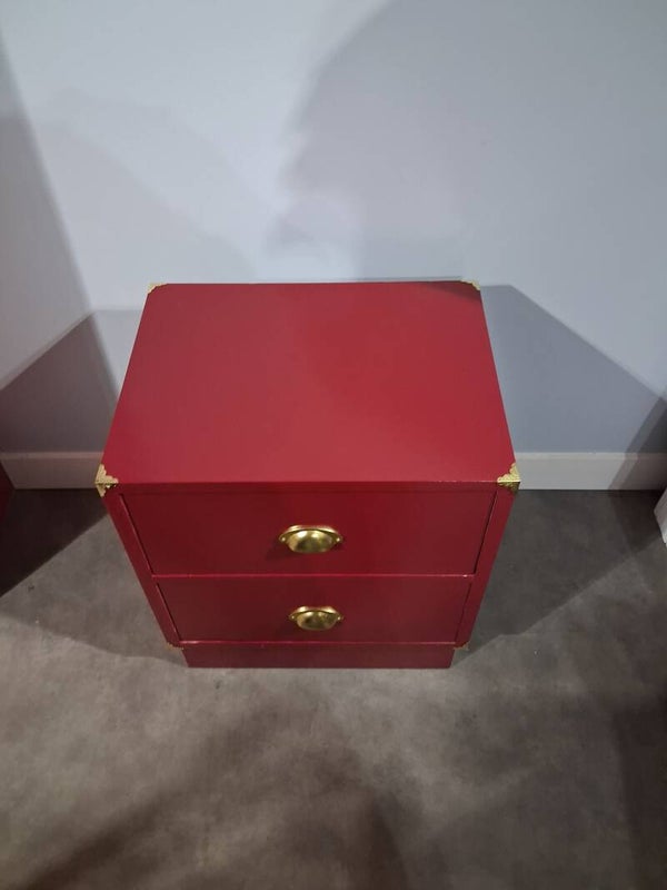 Meuble cube rouge 2 tiroirs angles et poignées métal doré