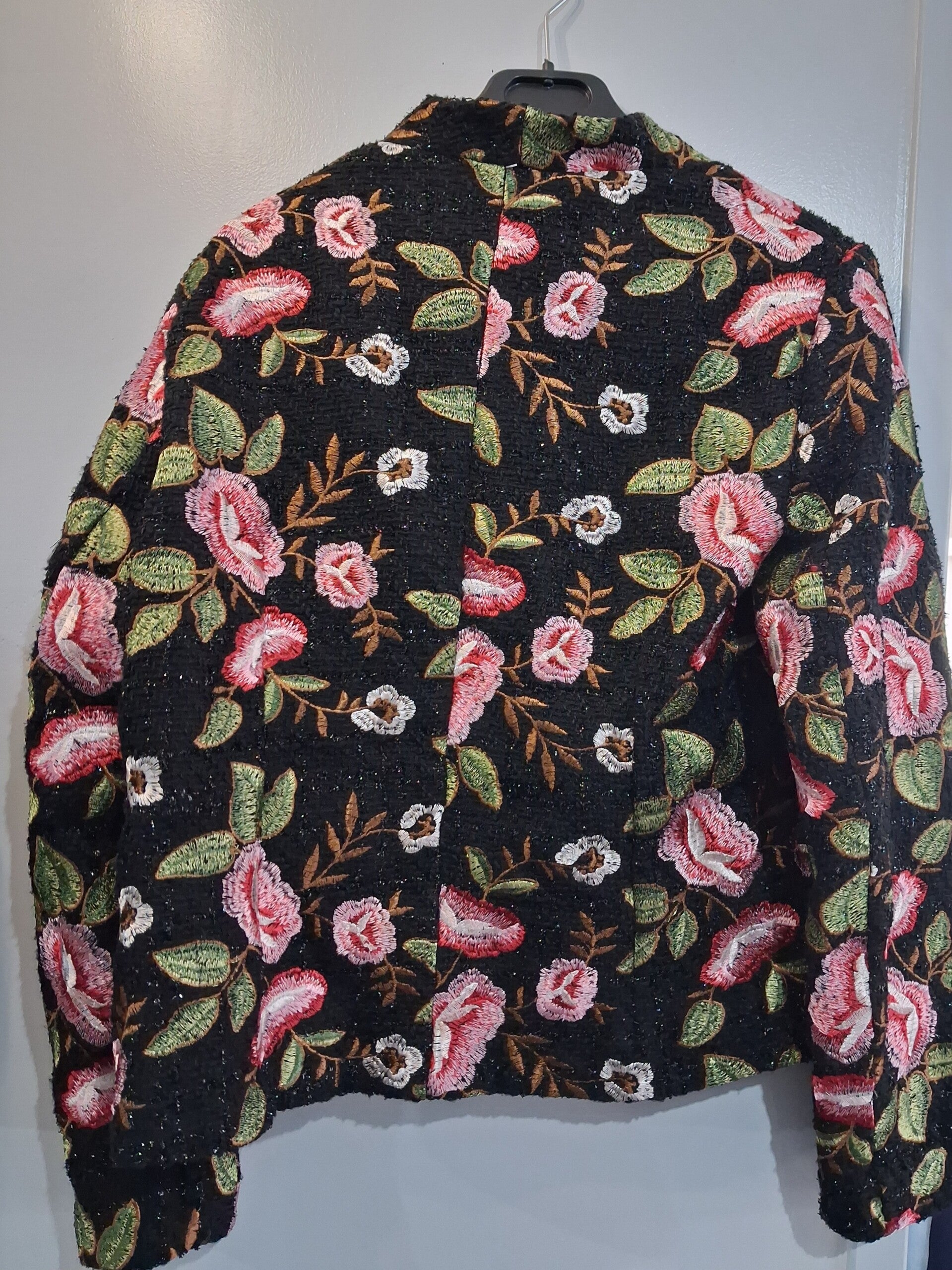 Veste noire brodée fleurs et feuilles doublure rouge 1 bouton